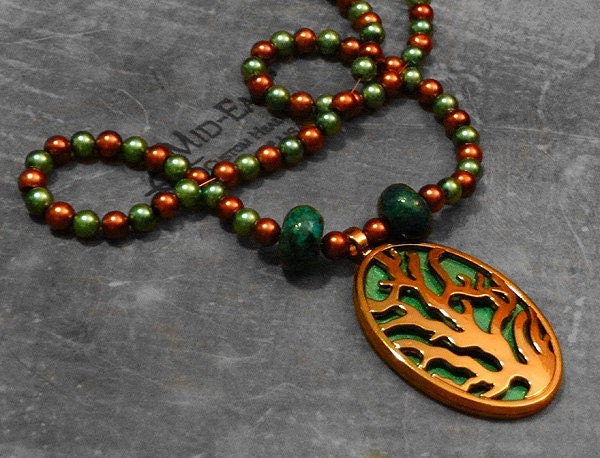 The shining teal of the ocean meets the vibrant bronze of the earth in this simple, striking necklace. With a pendant that could be taken as tree or coral – or both – it brings aspects of the sea and of the forest to the eye and to the wearer.